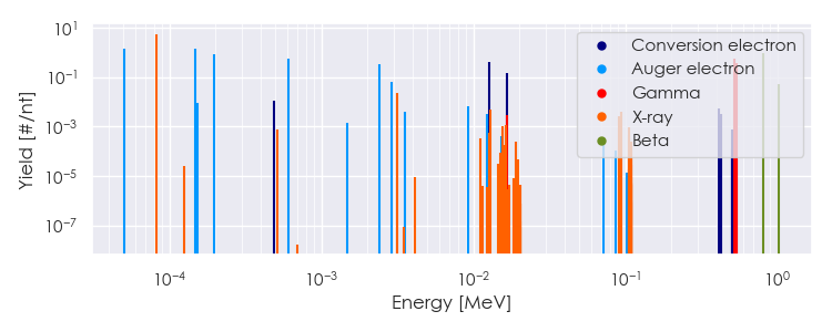 Spectra source: ICRP Publication 107: Nuclear Decay Data for Dosimetric Calculations. Ann. ICRP 2008, 38 (3).