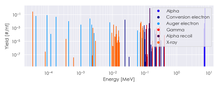 Spectra source: ICRP Publication 107: Nuclear Decay Data for Dosimetric Calculations. Ann. ICRP 2008, 38 (3).