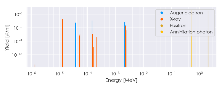 Spectra source: ICRP Publication 107: Nuclear Decay Data for Dosimetric Calculations. Ann. ICRP 2008, 38 (3).