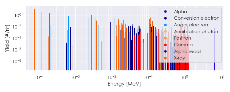 Spectra source: ICRP Publication 107: Nuclear Decay Data for Dosimetric Calculations. Ann. ICRP 2008, 38 (3).