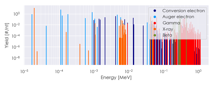 Spectra source: ICRP Publication 107: Nuclear Decay Data for Dosimetric Calculations. Ann. ICRP 2008, 38 (3).
