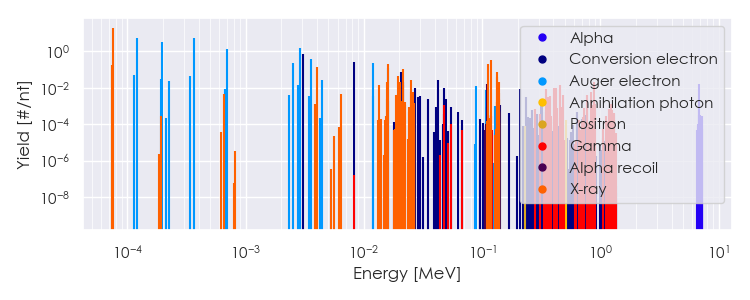 Spectra source: ICRP Publication 107: Nuclear Decay Data for Dosimetric Calculations. Ann. ICRP 2008, 38 (3).