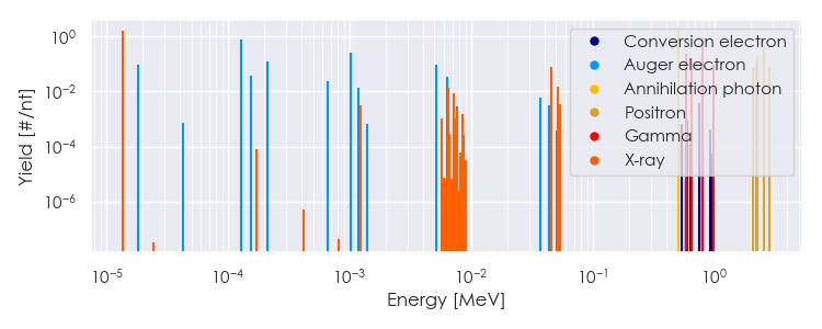 Spectra source: ICRP Publication 107: Nuclear Decay Data for Dosimetric Calculations. Ann. ICRP 2008, 38 (3).