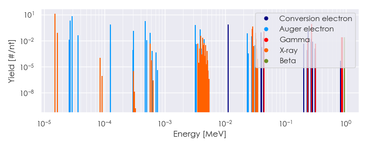 Spectra source: ICRP Publication 107: Nuclear Decay Data for Dosimetric Calculations. Ann. ICRP 2008, 38 (3).