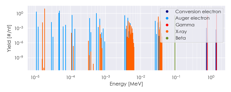 Spectra source: ICRP Publication 107: Nuclear Decay Data for Dosimetric Calculations. Ann. ICRP 2008, 38 (3).