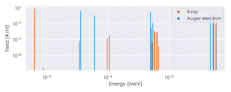 Spectra source: ICRP Publication 107: Nuclear Decay Data for Dosimetric Calculations. Ann. ICRP 2008, 38 (3).