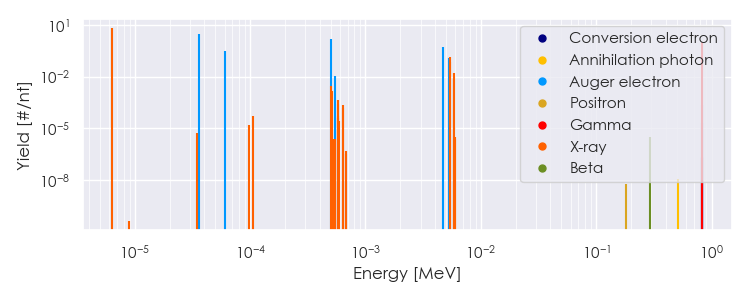 Spectra source: ICRP Publication 107: Nuclear Decay Data for Dosimetric Calculations. Ann. ICRP 2008, 38 (3).