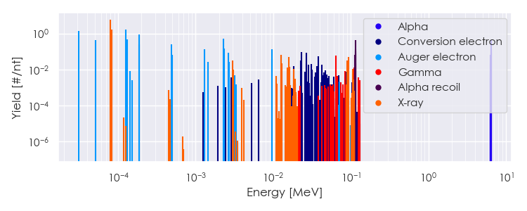 Spectra source: ICRP Publication 107: Nuclear Decay Data for Dosimetric Calculations. Ann. ICRP 2008, 38 (3).