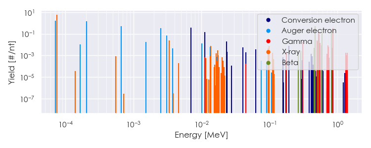 Spectra source: ICRP Publication 107: Nuclear Decay Data for Dosimetric Calculations. Ann. ICRP 2008, 38 (3).