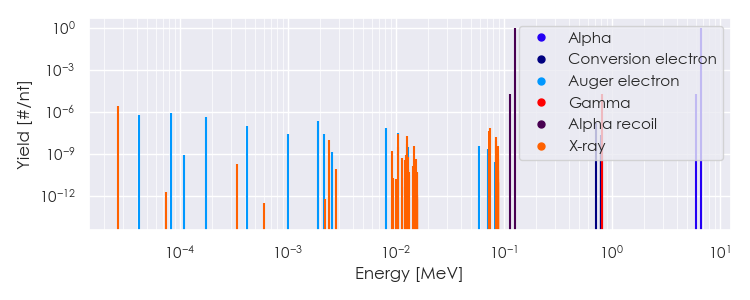 Spectra source: ICRP Publication 107: Nuclear Decay Data for Dosimetric Calculations. Ann. ICRP 2008, 38 (3).
