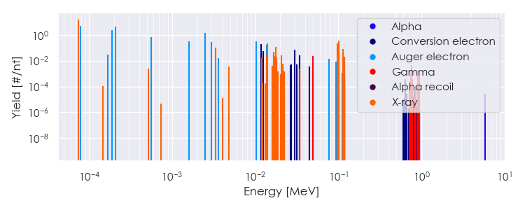 Spectra source: ICRP Publication 107: Nuclear Decay Data for Dosimetric Calculations. Ann. ICRP 2008, 38 (3).