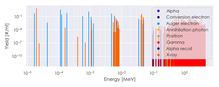Spectra source: ICRP Publication 107: Nuclear Decay Data for Dosimetric Calculations. Ann. ICRP 2008, 38 (3).