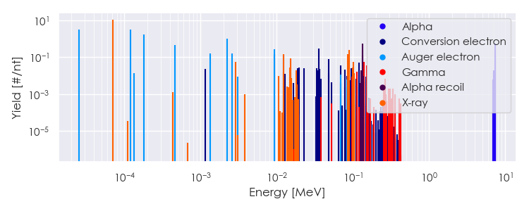 Spectra source: ICRP Publication 107: Nuclear Decay Data for Dosimetric Calculations. Ann. ICRP 2008, 38 (3).