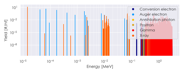 Spectra source: ICRP Publication 107: Nuclear Decay Data for Dosimetric Calculations. Ann. ICRP 2008, 38 (3).