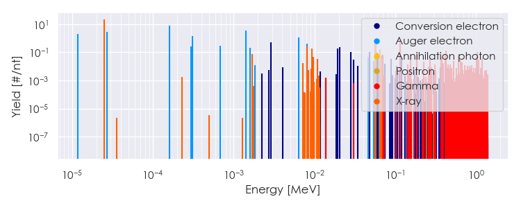 Spectra source: ICRP Publication 107: Nuclear Decay Data for Dosimetric Calculations. Ann. ICRP 2008, 38 (3).
