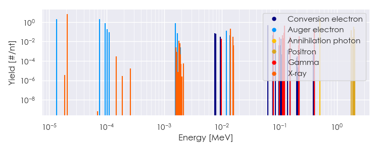 Spectra source: ICRP Publication 107: Nuclear Decay Data for Dosimetric Calculations. Ann. ICRP 2008, 38 (3).