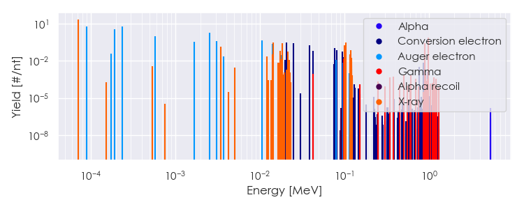 Spectra source: ICRP Publication 107: Nuclear Decay Data for Dosimetric Calculations. Ann. ICRP 2008, 38 (3).