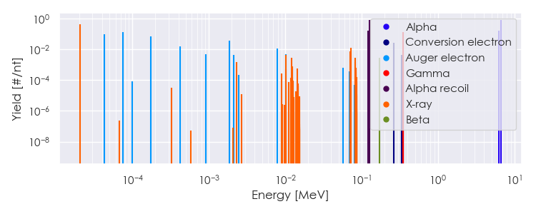 Spectra source: ICRP Publication 107: Nuclear Decay Data for Dosimetric Calculations. Ann. ICRP 2008, 38 (3).