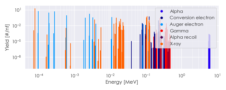 Spectra source: ICRP Publication 107: Nuclear Decay Data for Dosimetric Calculations. Ann. ICRP 2008, 38 (3).