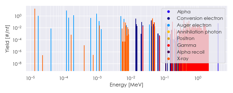 Spectra source: ICRP Publication 107: Nuclear Decay Data for Dosimetric Calculations. Ann. ICRP 2008, 38 (3).