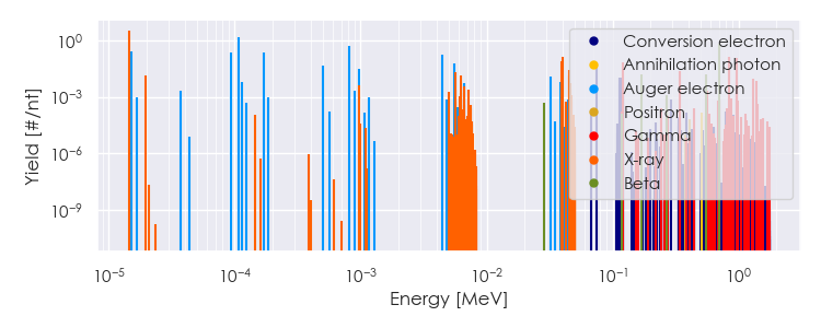 Spectra source: ICRP Publication 107: Nuclear Decay Data for Dosimetric Calculations. Ann. ICRP 2008, 38 (3).