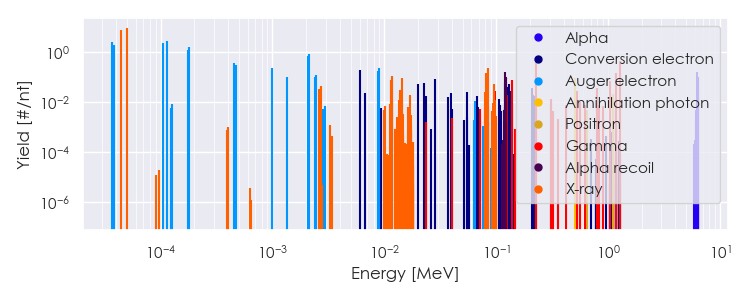 Spectra source: ICRP Publication 107: Nuclear Decay Data for Dosimetric Calculations. Ann. ICRP 2008, 38 (3).
