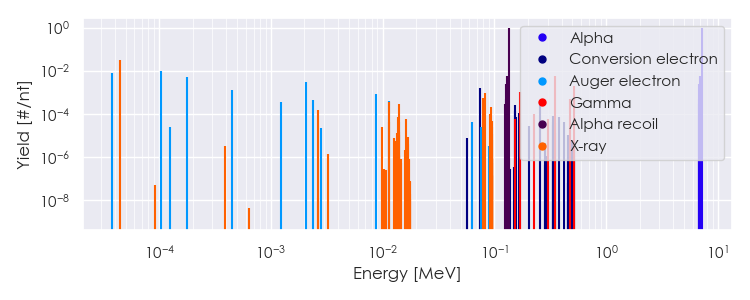 Spectra source: ICRP Publication 107: Nuclear Decay Data for Dosimetric Calculations. Ann. ICRP 2008, 38 (3).