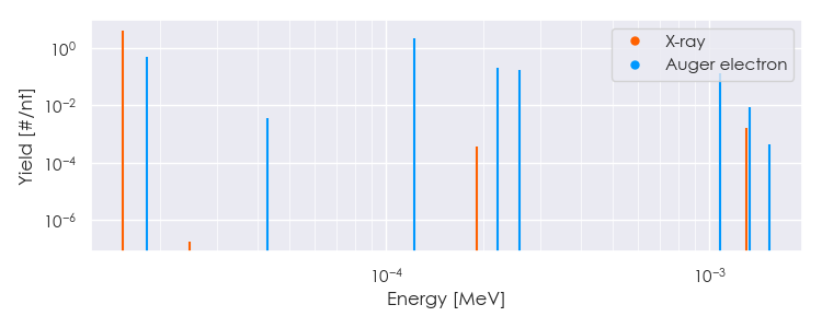 Spectra source: ICRP Publication 107: Nuclear Decay Data for Dosimetric Calculations. Ann. ICRP 2008, 38 (3).