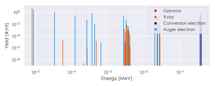 Spectra source: ICRP Publication 107: Nuclear Decay Data for Dosimetric Calculations. Ann. ICRP 2008, 38 (3).