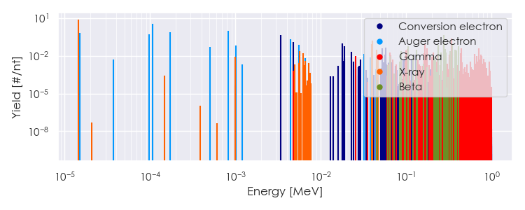 Spectra source: ICRP Publication 107: Nuclear Decay Data for Dosimetric Calculations. Ann. ICRP 2008, 38 (3).