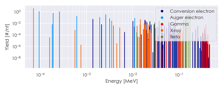 Spectra source: ICRP Publication 107: Nuclear Decay Data for Dosimetric Calculations. Ann. ICRP 2008, 38 (3).