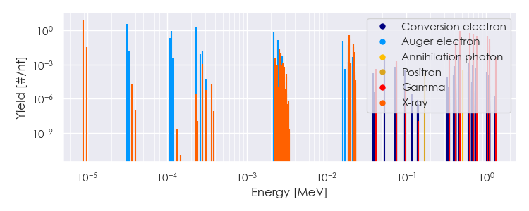 Spectra source: ICRP Publication 107: Nuclear Decay Data for Dosimetric Calculations. Ann. ICRP 2008, 38 (3).