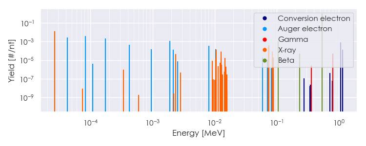 Spectra source: ICRP Publication 107: Nuclear Decay Data for Dosimetric Calculations. Ann. ICRP 2008, 38 (3).