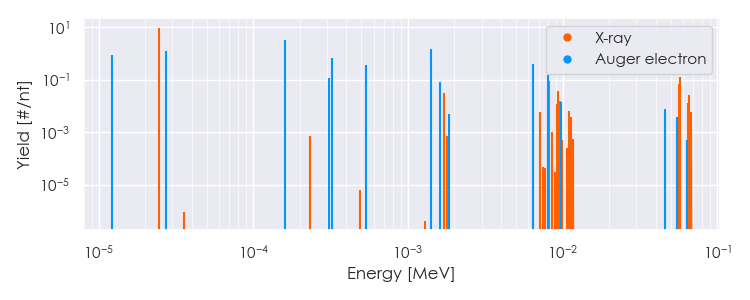 Spectra source: ICRP Publication 107: Nuclear Decay Data for Dosimetric Calculations. Ann. ICRP 2008, 38 (3).